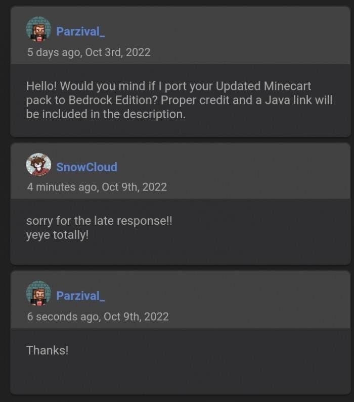 Welcome to another bedrock port of mine! This Pack named “Updated Minecarts” was originally made by SnowCloud for Java Edition and was ported by me to Bedrock Edition. An updated minecart to replace the old boring one!